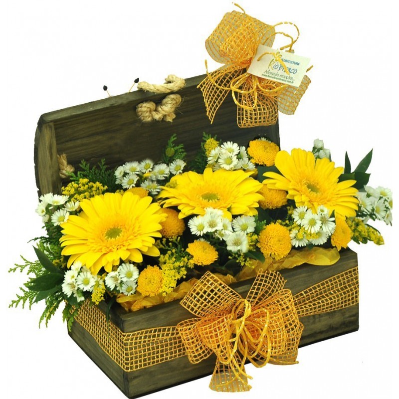 Lindo baú de madeira contendo gérberas ( cor em estoque)