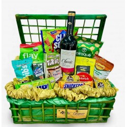 Linda caixa decorada contendo um lindo balão metalizado com vareta, deliciosas batatas Pringles, , suco, bolinho recheado, biscoitos doce e salgados, balas de goma e bombons