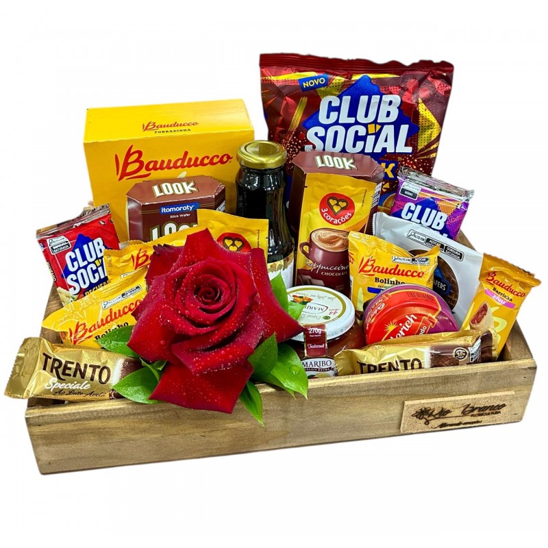 Linda bandeja de madeira para o café da manhã contendo, fino suco, torradinhas, biscoitos doce e salgados, pães de mel, bolinhos recheado ,waffer, saches de café, patê, geleia e chocolates
