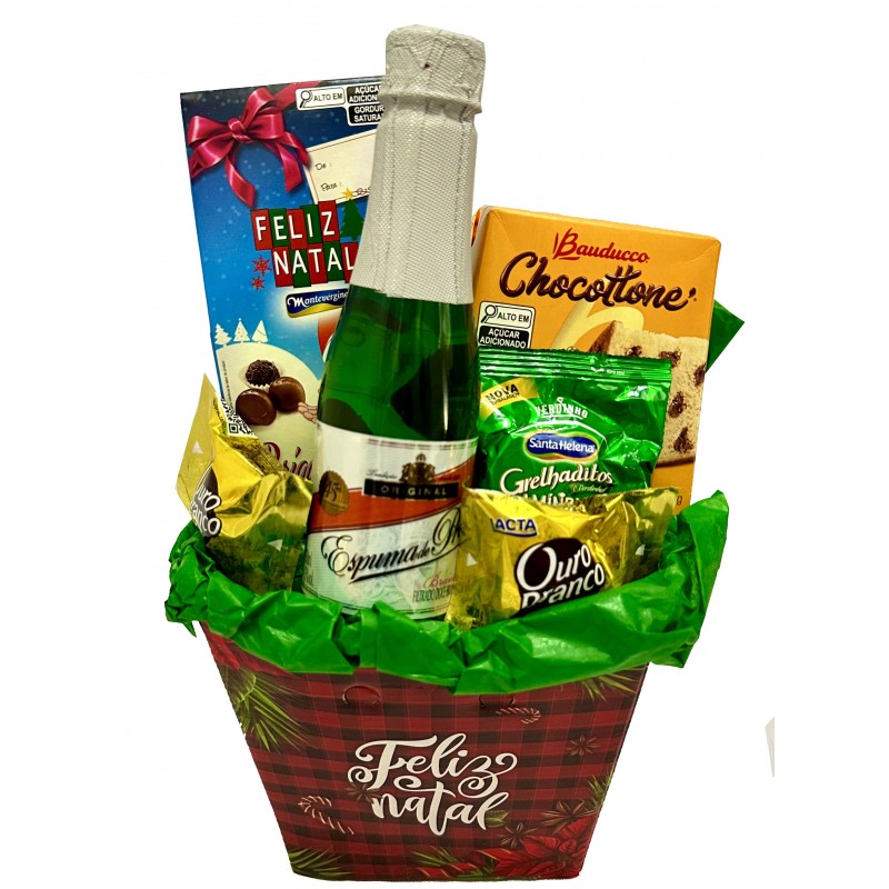 Linda caixa decorada com celofane, mini espumante, caixa de bombons ,mini panetone, amendoin e bombons ouro branco
