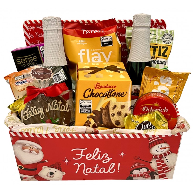 Linda caixa de natal contendo duas mini espumante, biscoitos doce e salgados, Bibis,bolinho recheado, mini panetone da Bauducco, patê chocolate de natal, amendoim e bombons. Ótima sugestão de presente