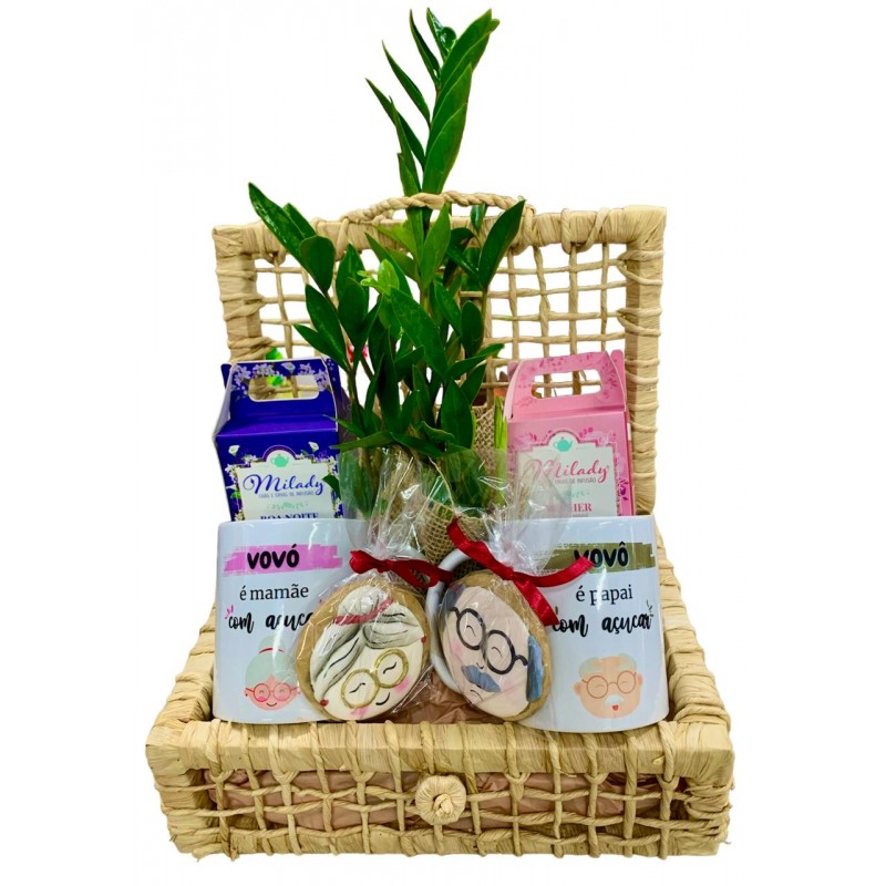 Cesta de palha decorada com uma folhagem Zamioculca, duas lindas canecas de avós de porcelana, finos chás, e deliciosos biscoite de mel personalizado