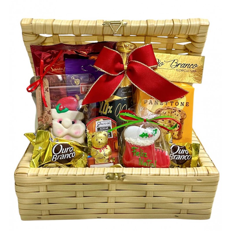 Baú decorado de Natal com mini espumante sem álcool , biscoitos de Natal, mini panetone, ursinho de chocolate da Suíça Lindt, mix castanha ,biscoito amanteigado e bombons