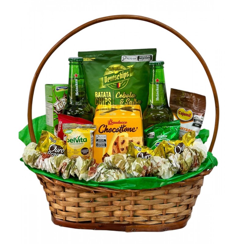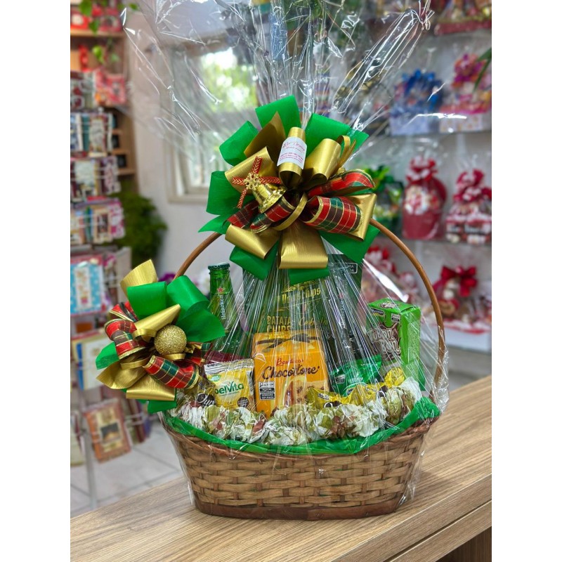 Cesta decorada com celofane e tops recheado com cervejas, panetone , batatinha , castanha, amendoim, waffer recheado, biscoito, chocolate kit kat e bombons