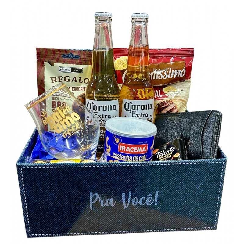 Caixa decorativa envolta em celofane, cuidadosamente mon.tada com uma fina carteira de couro, cervejas selecionadas, um lindo copo personalizado para o Pai, biscoitos saborosos e amendoins crocantes — um presente especial pensado nos mínimos detalhes para surpreender e emocionar.
