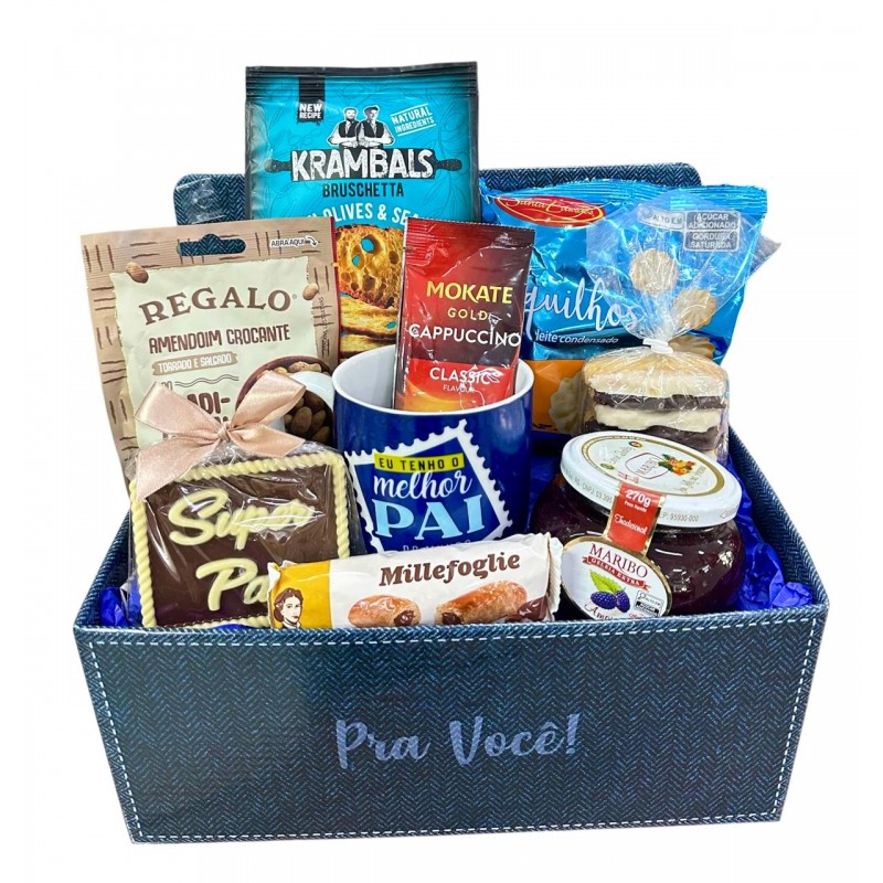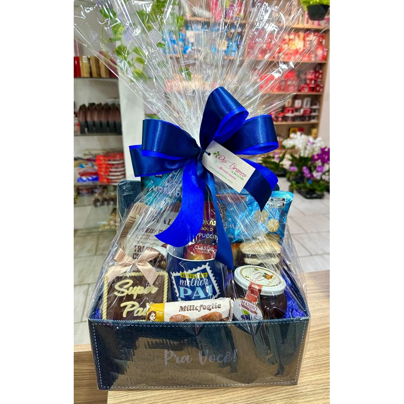 "Uma fina e charmosa caixa decorada, cuidadosamente montada para surpreender e encantar. Contém uma elegante caneca de porcelana, uma deliciosa geleia, chocolate personalizado especialmente para o Dia dos Pais, amendoins crocantes, biscoitos doces e salgados, um aromático sachê de café e um irresistível bolinho recheado. Um presente pensado com carinho para tornar o dia dele ainda mais especial."