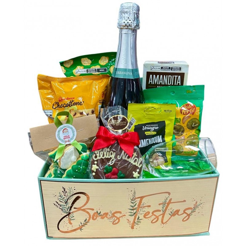 Uma caixa decorada que celebra o Natal com elegância. Nela, a fina espumante Terra Nova harmoniza com deliciosas Amanditas, panetone macio, biscoito salgado, amendoim especial e azeitonas selecionadas. Biscoitos natalinos e um chocolate personalizado completam este presente sofisticado e cheio de sabor.