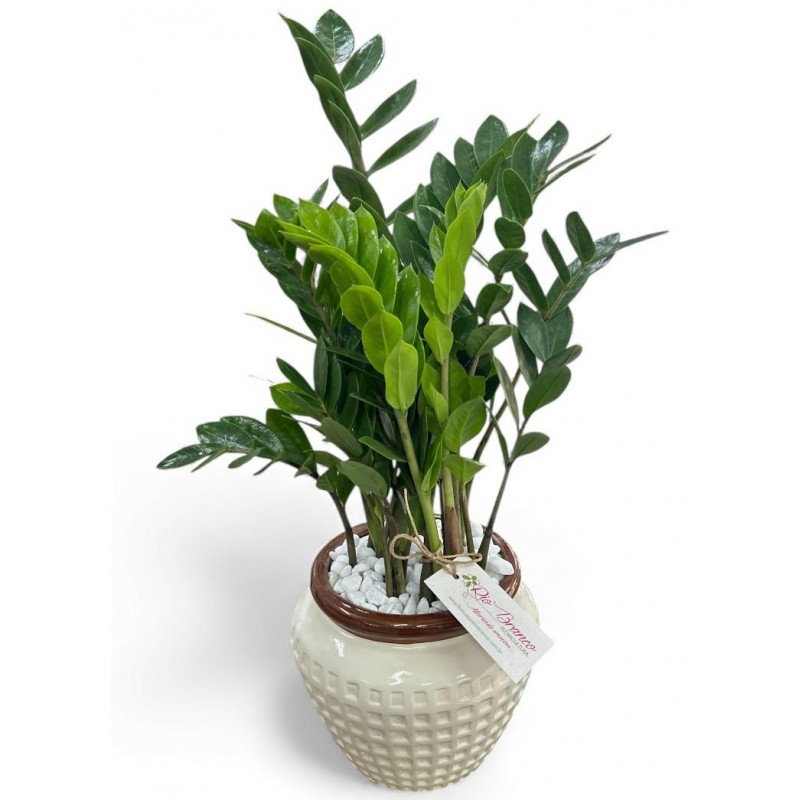 Folhagem Zamioculca em um fino vaso de cerâmica, unindo sofisticação, frescor e beleza natural. Uma peç a que eleva qualquer ambiente, trazendo leveza, modernidade e um toque de verde que transforma o espaço com charme e equilíbrio. 45 cm altura
