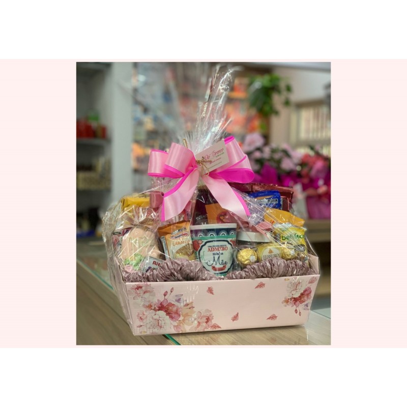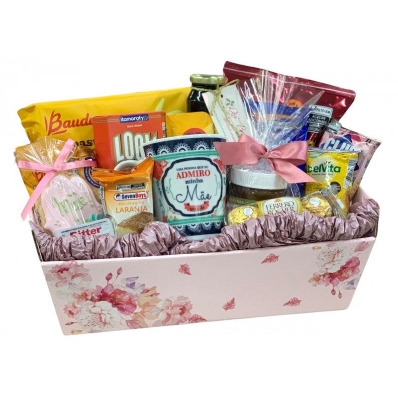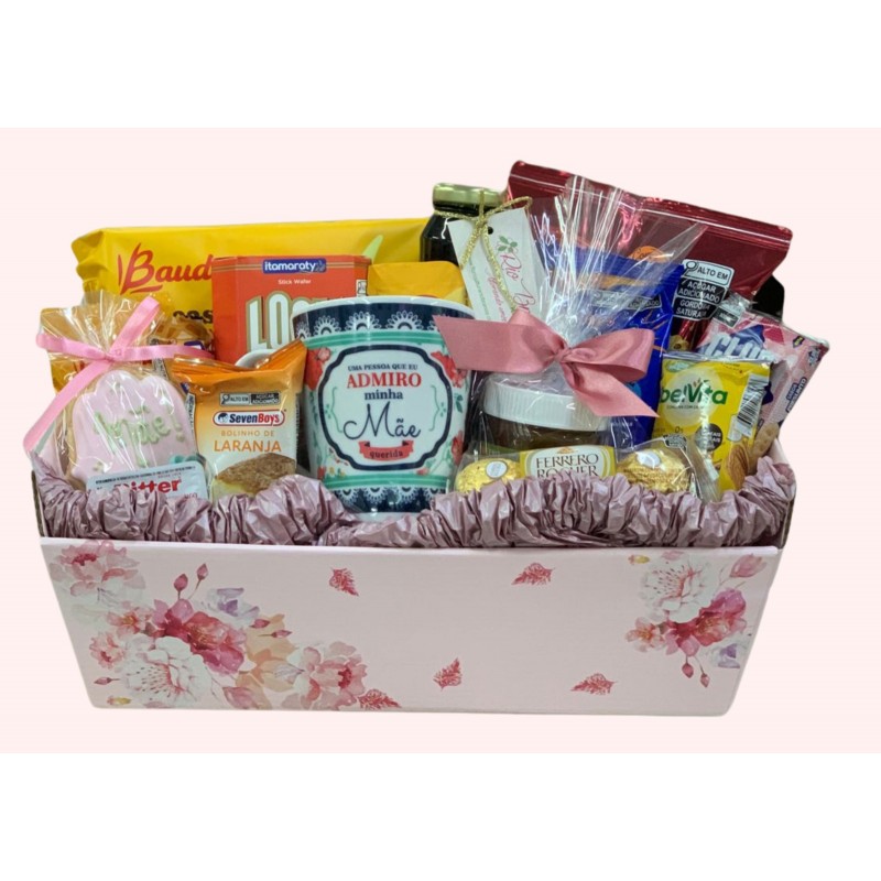 Café da manhã para mamãe é constituída por uma caixa decorada, xícara, biscoitos doces e salgados, bolinho recheado, waffer ,fino suco, nutella, torrada, sucrilhos,cereal em barra e deliciosos bombons ferreros.
