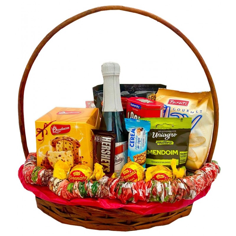 Cesta de Natal contendo uma mini espumante ,mini panetone, biscoito amanteigado, waffer recheado, amendoim, biscoito salgado, cereal em barra e deliciosos bombons