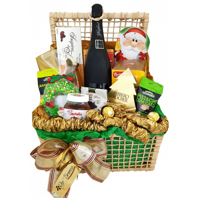 baú em Palha toda decorada, nela possui uma espumante freixenet brut, biscoito de natal,nutella, amendoim, castanha ou pistasche ,uva em passas,mini panetone, biscoito salgado, bombons de chocolate ao leite da Montevérgine, Ferrero rocher t 8 e bombons FerreRo rocher soltos também