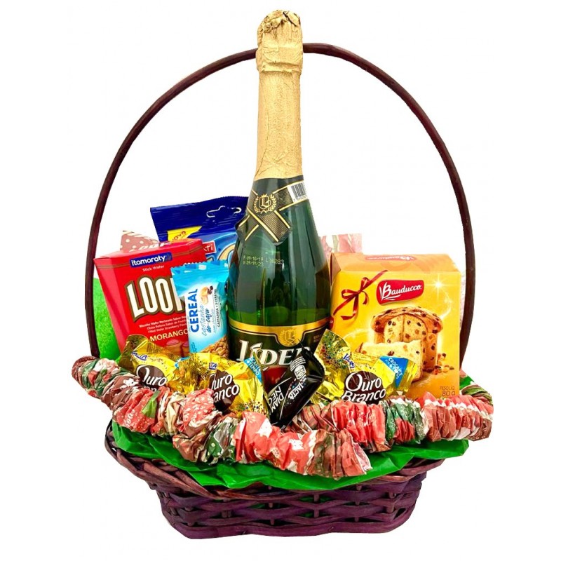 Cesta decorada constituída com uma filtrado, mini panetone, biscoito salgado, waffer recheado, cereal em barra, barra de chocolate pequena e deliciosos bombons