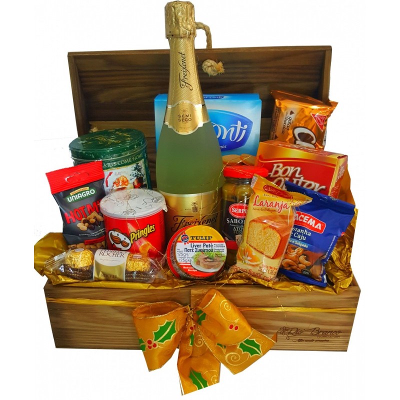 Fino baú de madeira constituído por uma fina champanhe espanhola, panetone na lata da Santa Edwiges, torradinhas, patê importado, biscoito Bom Gouter, biscoito chocooky, azeitona importada, bolinho recheado da Santa edwiges, castanha, hot mix da Uniagro, Batata pringles e deliciosos Ferrero Rocher